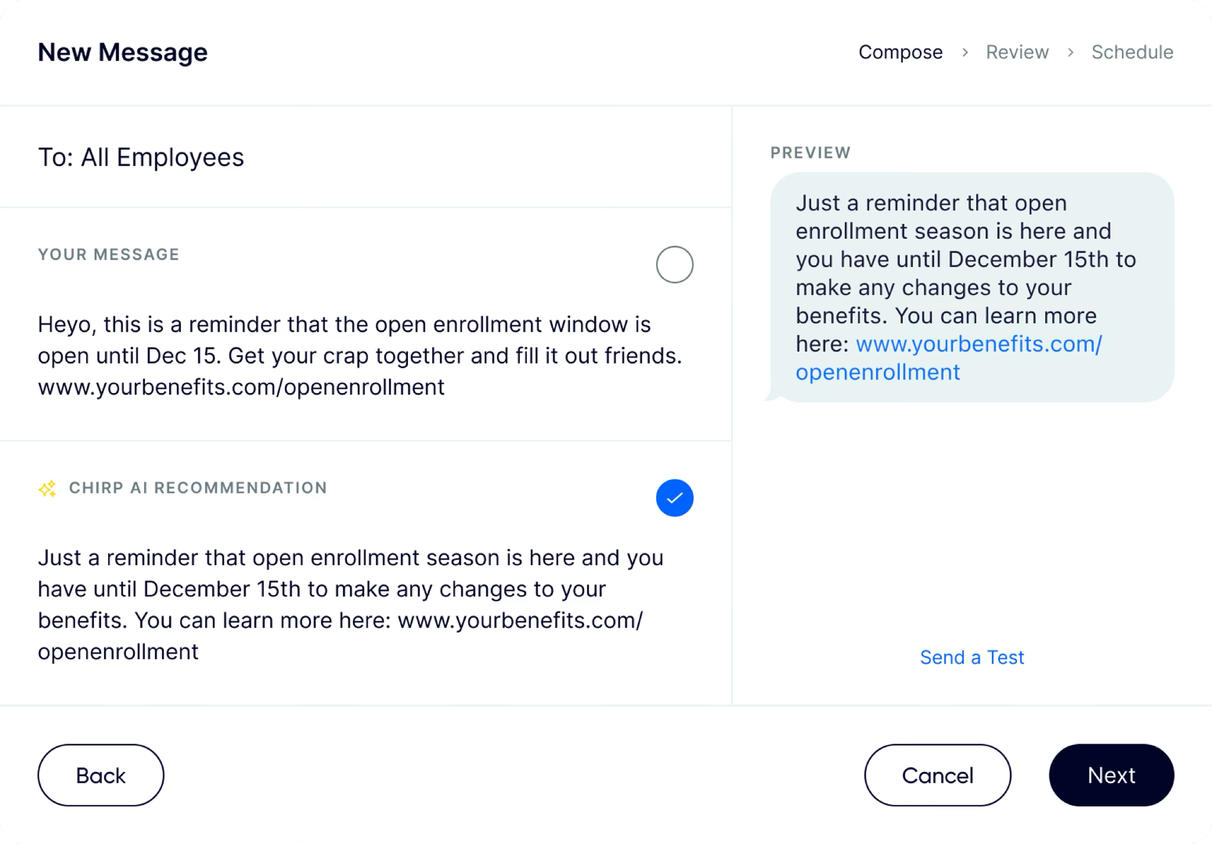 Easy, safe, secure integration of employee contact information with intuitive list management for targeted outreach.